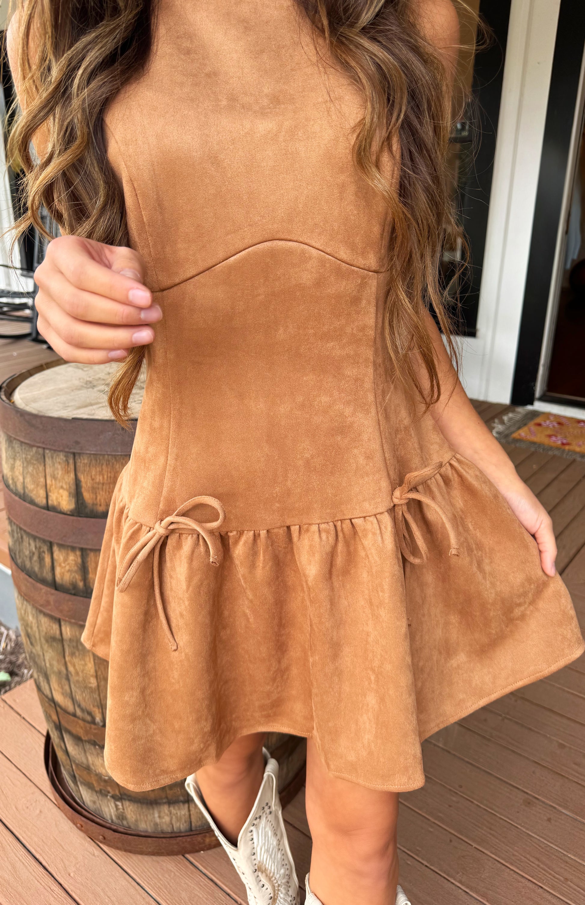 A soft-suede-inspired mini dress that blends rustic warmth with feminine charm. The flattering seamed bodice and ruffle hem with tie details create a perfectly tailored silhouette. Effortless for fall days or cozy nights out. Style with tall boots and gold accessories for the ultimate seasonal statement.