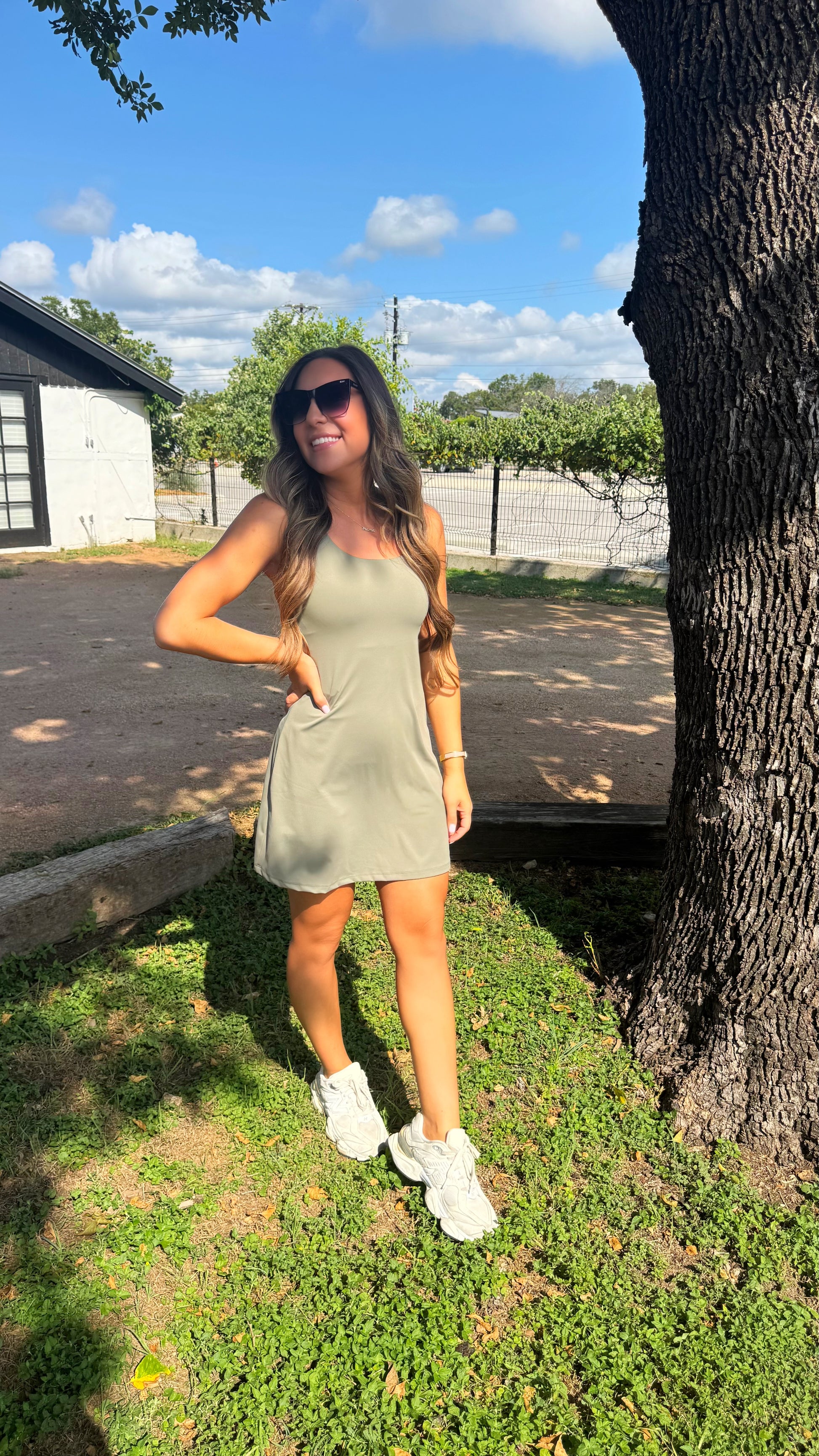 This minimalist dress is a slightly fitted and relax fit that is lightweight and stretchy. With built in shorts underneath, its the perfect fit for a casual day or night out.