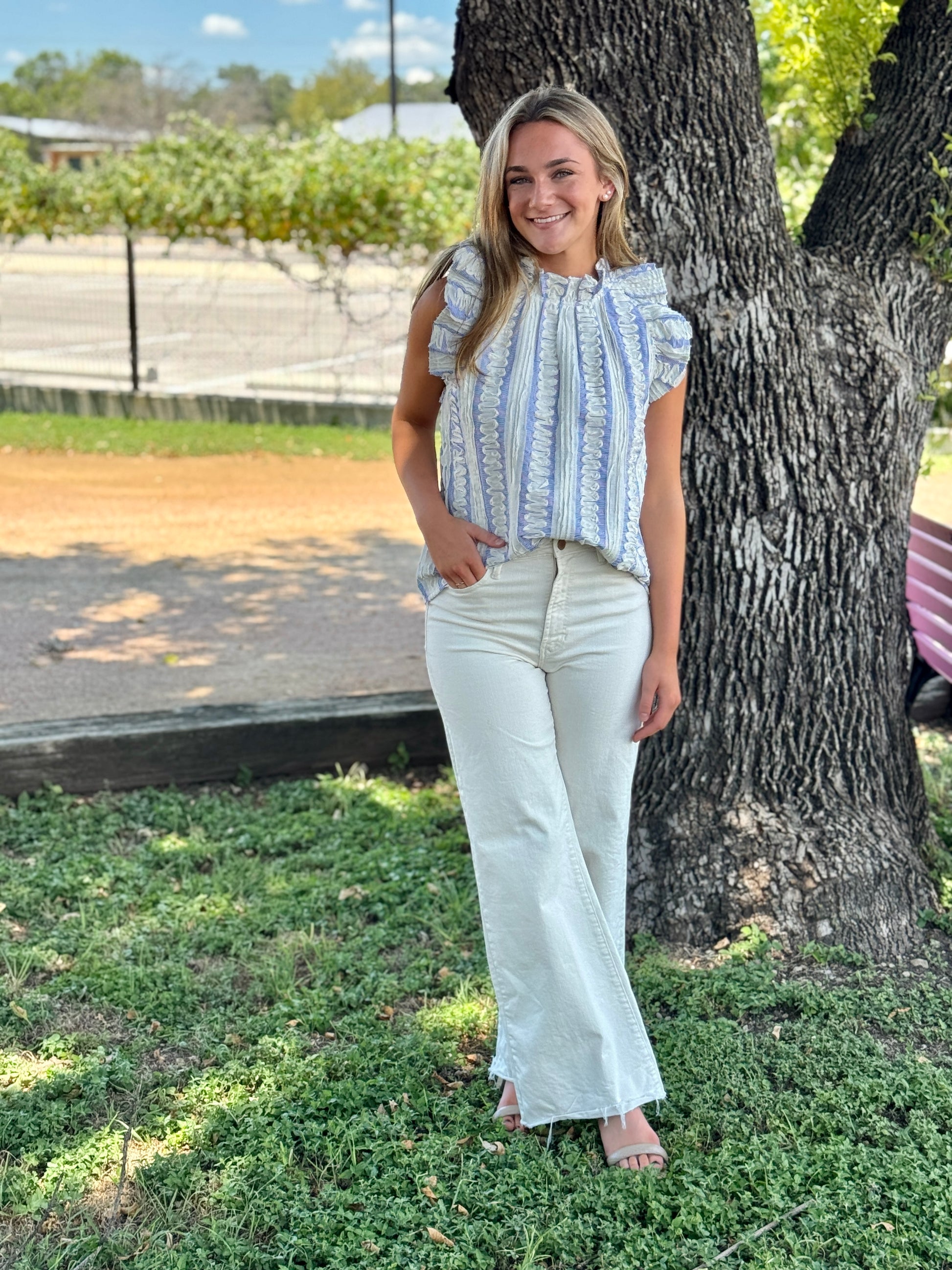 This top features a structured silhouette with vertical ivory ruffle trim accents over a fine blue and white pinstripe fabric. This top gives a light and nautical feel. The neckline is modest with a gentle ruffle detail. It is a standout piece that can paired with crisp white jeans or a linen skirt for a polished, breezy look.